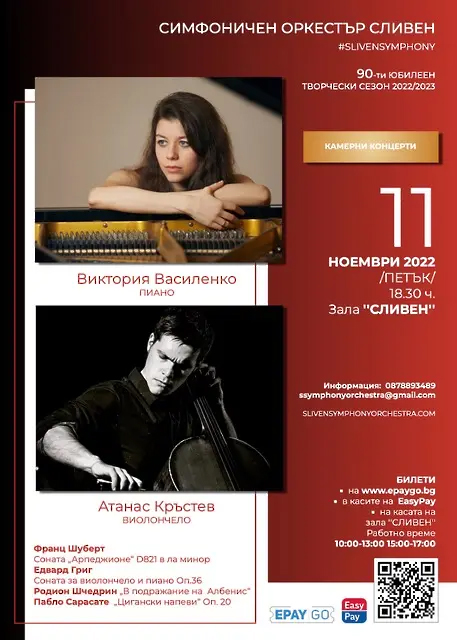 Дуо Атанас Кръстев (виолончело) и Виктория Василенко (пиано) са от най-утвърдените млади български музиканти, доказали се на българската и международната сцена като солисти и камерни изпълнители. И двамата са носители на огромна колекция български и чуждестранни отличия и несъмнено ще предложат и на сливенската публика музикална вечер, която би впечатлила и най-взискателните почитатели по европейските столици.